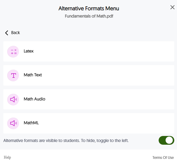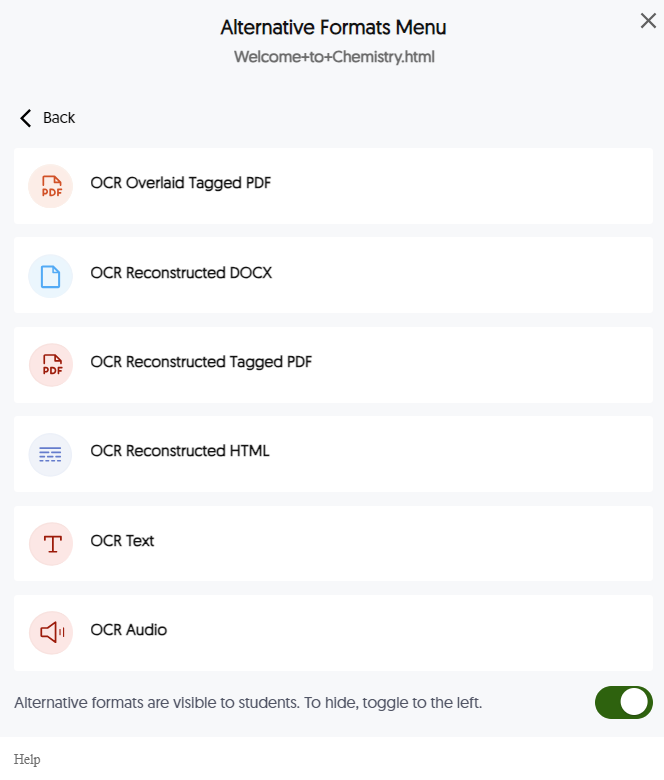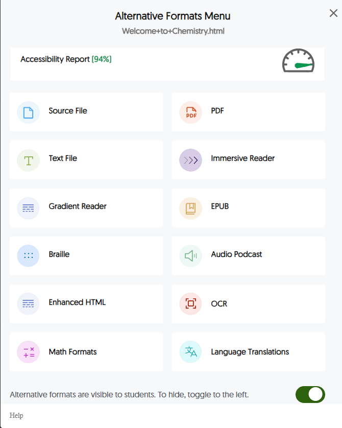 Due to the variety of viewer needs today, students can retrieve alternative file formats to meet their individual needs. Whether a visually impaired viewer requires text-to-speech narration for easier access to digital content, or if they prefer to read the document in a more convenient web format, Panorama's Alternative Formats is a great resource available directly within the LMS course section. Instructors can also toggle Visible to Students ON or OFF to enable or disable Student access to individual files.