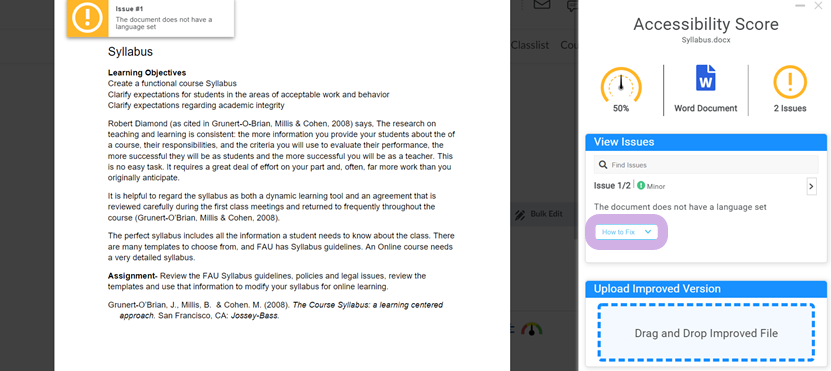 Once you have read through the Accessibility Report, the content can go through and fix the highlighted issues directly on your document. Once all of the improvements have been made, the content owner can drag and drop their corrected document into the Accessibility Report window under the Upload Improved Version section.